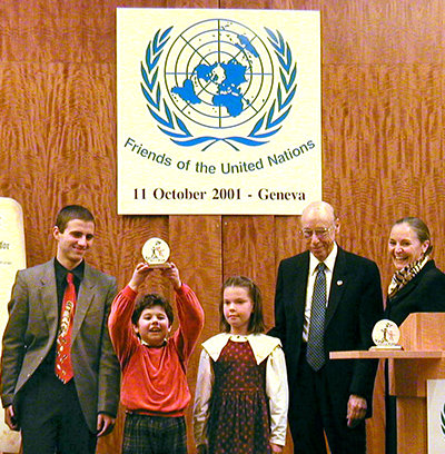 Em 2001, um concurso mundial de redação foi lançado e questionou a juventude: “O que são direitos humanos?”. Os vencedores receberam o prêmio no Hotel President Wilson em Genebra. A partir das respostas dadas, ficou claro que as crianças estavam mais preocupadas — e extraordinariamente mais articuladas — quanto a mudar as condições na sociedade do que geralmente se costuma pensar. Com este estímulo, nasceu a Jovens pelos Direitos Humanos.