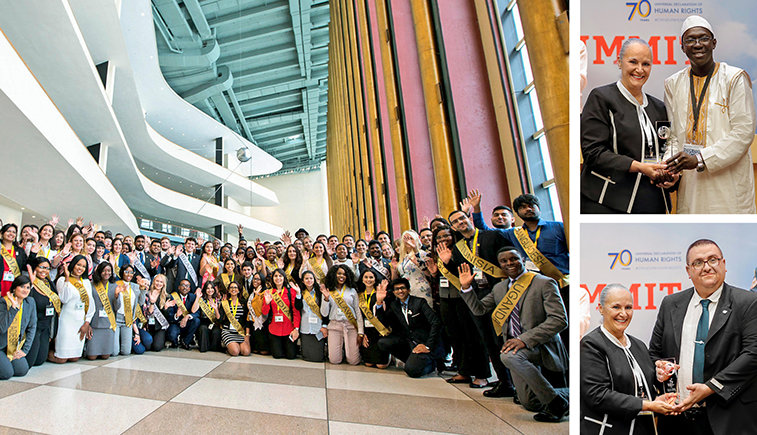 Nas Cúpulas Internacionais de Direitos Humanos, defensores exemplares dos direitos humanos recebem o Prêmio de Herói dos Direitos Humanos. Para a 15ª Cúpula Anual deste ano (ver página 3), realizada na sede das Nações Unidas em Nova York, a Dra. Mary Shuttleworth, Presidente da Jovens pelos Direitos Humanos Internacional, entregou os prêmios a três destacados humanitários: