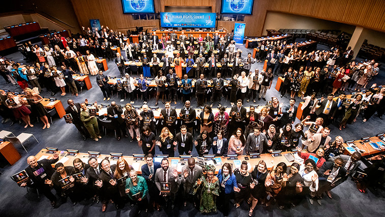 Esperança e realizações foram temas comuns exibidos na sessão de abertura da 16ª Cúpula Internacional dos Direitos Humanos, transmitida ao vivo da Sala de Conferências 4 da Sede das Nações Unidas em Nova York. Com convidados de 78 nações, a cúpula de 2019 de três dias focou-se nas comunidades que trabalham juntas para erradicar os abusos dos direitos humanos por meio de instruir as pessoas sobre a Declaração Universal dos Direitos Humanos das Nações Unidas (DUDH).